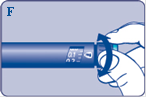 ·Insérez l'aiguille dans votre peau. Pour injecter la dose, appuyez à fond sur le bouton-poussoir. Prenez garde à n'appuyer sur le bouton-poussoir qu'au moment de l'injection [G]. · Gardez le bouton-poussoir totalement enfoncé et laissez l'aiguille sous la peau pendant au moins 6 secondes. Ceci permettra de garantir que la totalité de la dose a été délivrée. |