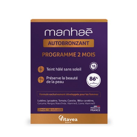 Vitavea Manhaé Autobronzant, 60 gélules | 22,99 € | Voir le site de la pharmacie |